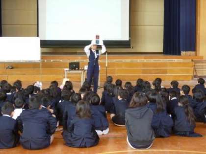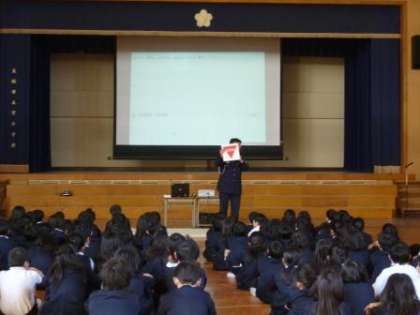 生野警察の方に来ていただいて、正しい歩行の仕方、正しい自転車の乗り方を教えてもらいました。車は急には止まれないし、死角があるので、見えないところがあり、交差点を曲がるときや、渡るときにどんなところに気をつけたらいいのかも教えてもらいました。