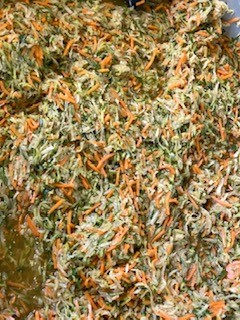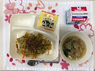 今日の給食では、ひき肉、きゅうり、にんじん、切り干しだいこんを具材として使っています。