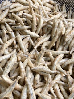 ●きびなごは、あたたかい海を好む魚です。春から初夏にかけて、卵を産むために日本の海岸近くにやってきます。この頃のきびなごが一年で一番おいしい(旬)です。体調10センチメートルくらいのちいさな魚です。