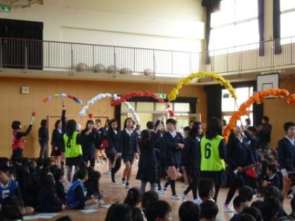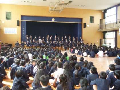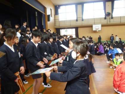 2時間目に卒業を祝う会が行われました。チャレンジ班で作ったお祝いのメッセージを書いた色紙を班長さんに渡しました。その後、6年生がお礼に、「コンドルは飛んでいく」の合奏を聞かせてくれました。また、そうじの時間に使ってもらえるように、家庭科の時間に作ったぞうきんを各クラスに頂きました。