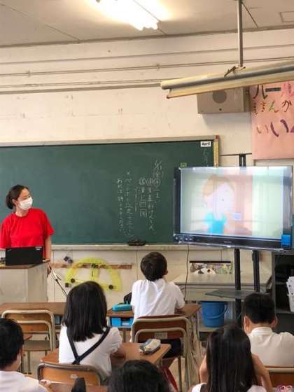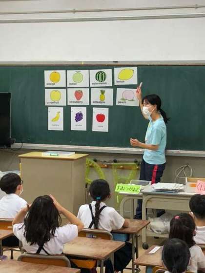 今日の朝学習は、『イングリッシュタイム』です。低学年の子どもたちは、「banana」(バナナ)などの果物の名前を楽しそうに発音していました。高学年の子どもたちは、自分の「好きなこと」や「得意なこと」を英語で発表していました。