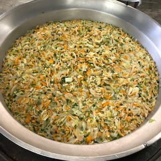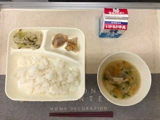 献立は、オイスターソース焼きそば、きゅうりの中華あえ、こくとうロールパン、牛乳です。