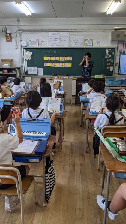 二拍子、三拍子の学習です。カスタネットやトライアングル、タンブリン、すずを使います。はじめはみんなで同じリズムを打ってみました。慣れてきたら楽器ごとにリズムを変えて打ってみます。曲にうまく合わせられるかな。二拍子、三拍子にのれるかな。拍を感じながらリズムを重ねる事ができました。