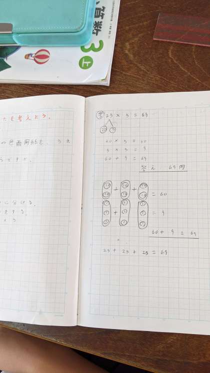 二桁のかけ算はどうやったらできるかな?計算の仕方の見通しをもち、自分で考えノートに書きました。いろいろなやり方が出てきました。友だちの発表もしっかり聞くことができました。