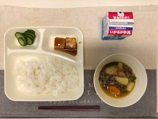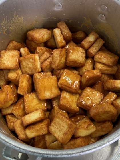 ●あつあげのみそだれかけは、蒸し焼きにしたあつあげに、赤みそ、さとう、こいくちしょうゆ、湯をあわせて煮たたれをかけています。