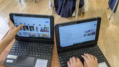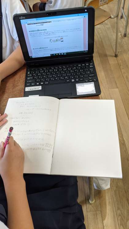 5年生は秋の遠足で万博公園へ行きます。万博パビリオンを見学するので、この機会に興味のある外国についての調べ学習をはじめました。文化、食べ物、洋服、建物、調べたい事はたくさんあります。タブレットを使って調べ、まずノートにまとめています。それをグループで模造紙にまとめます。どんな発表になるか楽しみです。