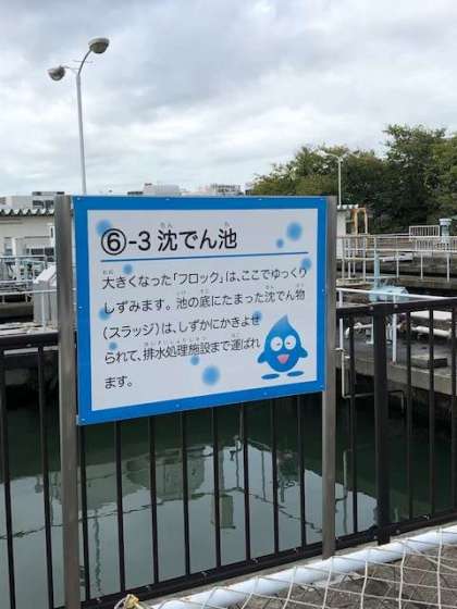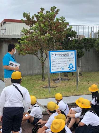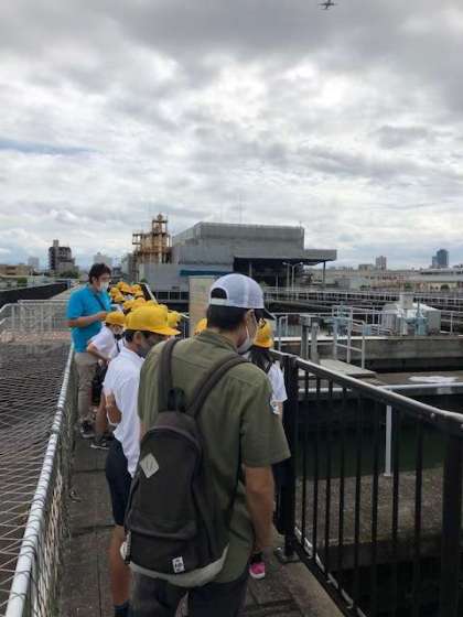 浄水場の施設の中を歩いて見学しています。施設の中は、とても広いです。