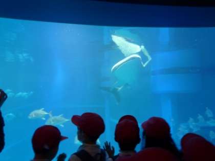水槽で泳ぐイルカやえいを見て歓声を上げていました。また、大きいジンベイざめに驚いていました。体験コーナーでの、さめやえいを触れるコーナーではこわごわ触っている子もいました。