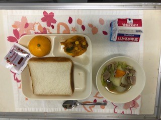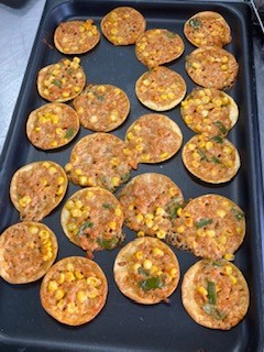 ●今日の給食では、ピザ生地のかわりにぎょうざの皮を使い、ピザソース、ツナ、コーン、ピーマン、チーズをのせて焼いた変わりピザが登場します。