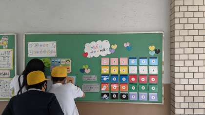 保健室前の掲示板は月ごとに変わります。11月は「齒みがきの大切さ」と「心の色」です。子どもたちが楽しく学べるように今月はパズルとカードになっています。カードをめくると、子どもたちの心が前向きになれるようなメッセージが書かれています。ぜひやってみてください。
