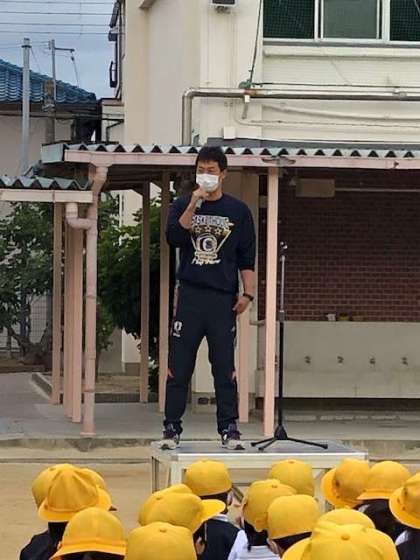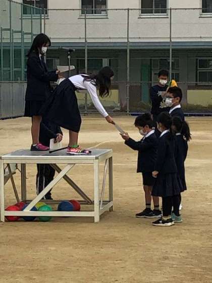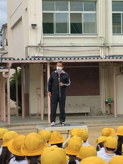 次に、給食委員会から「完食賞」と「エプロン賞」の表彰があり、生活指導の先生から「チャイムの合図を守ること」「下校の仕方」についてお話がありました。