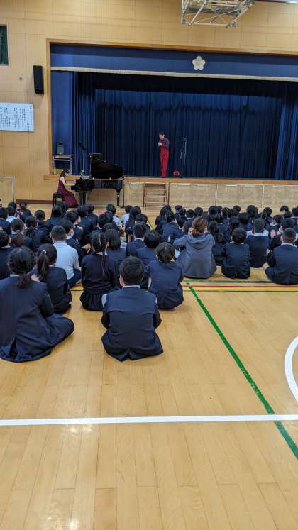 「LARGO」というグループの方々に来ていただき、音楽鑑賞会を行いました。久しぶりに複数学年で集まり、手拍子をしたり、かけ声をかけたりして一緒に楽しみました。みんなで一緒にすることの楽しさを思い出したひとときした。素敵な生演奏とお話で、心豊かになった時間でした。