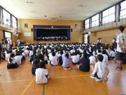 始めに、それぞれの教室で自己紹介をしました。その後、講堂へ移動して、前期の代表委員の紹介がありました。それから、たてわり班でクイズをしました。