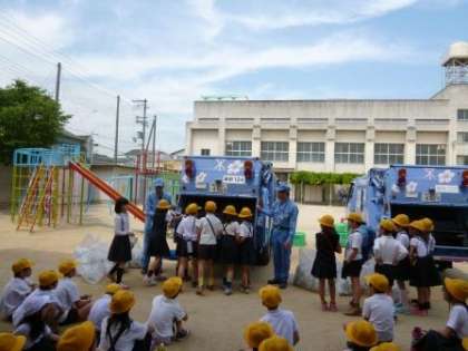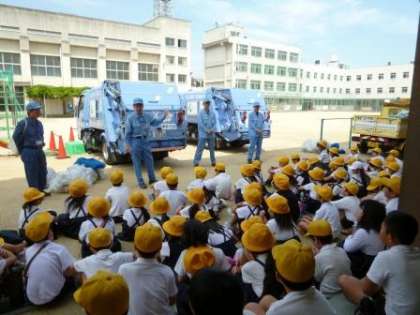 環境事業局の方に来ていただき、ごみの種類、分別の仕方などを教えていただきました。はじめに、パッカー車にペットボトルや空き缶などを子どもたちが入れていきました。後で、車の中から出してもらうと、そのままの形で出てきたので、驚いていました。
