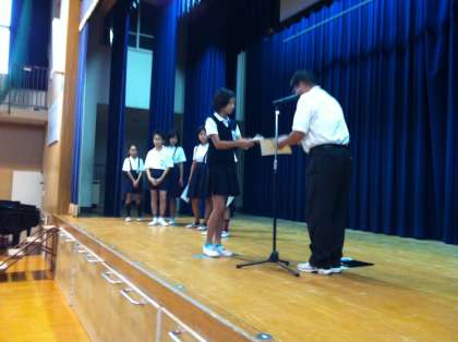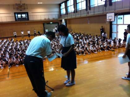 ここでは、始業式の中から夏休みの間に大阪プールで行われた大阪市児童水泳記録会に参加した児童に記念の賞状が渡されましたので、紹介したいと思います。
