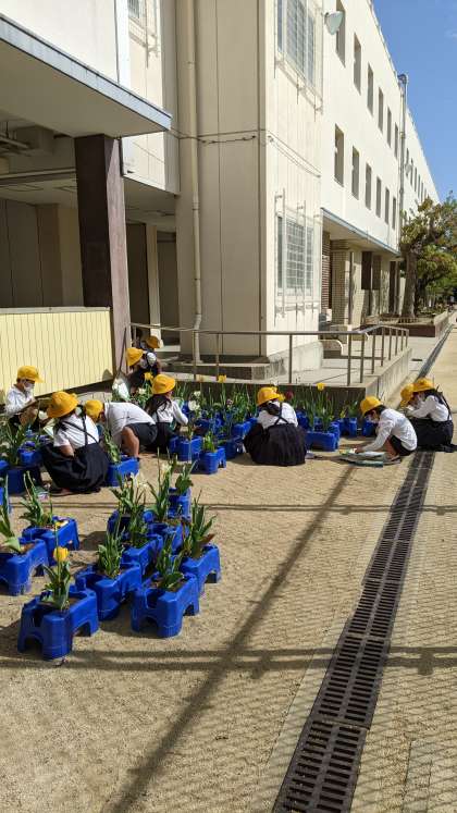 一年生の時に球根を植えたチューリップがきれいに咲いています。入学式、始業式にも可愛らしい花が通路を飾ってくれました。水やりを続けてきましたが、どれだけ大きく育ったかな、咲いたかな、今日はじっくり見てみました。もう花びらが落ちた物もあるようです。観察カードにしっかりまとめることができました。