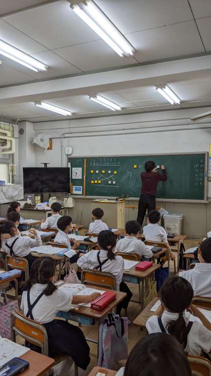 学校にはいろんな教室があるよ。2年生がやさしく教えながら、学校探検をしています。