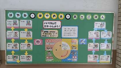 5月になり、保健室前の掲示板が変わりました。「はやね・はやおき・朝ごはん」についてです。自分の生活を振り返り、チャレンジしてみてください。