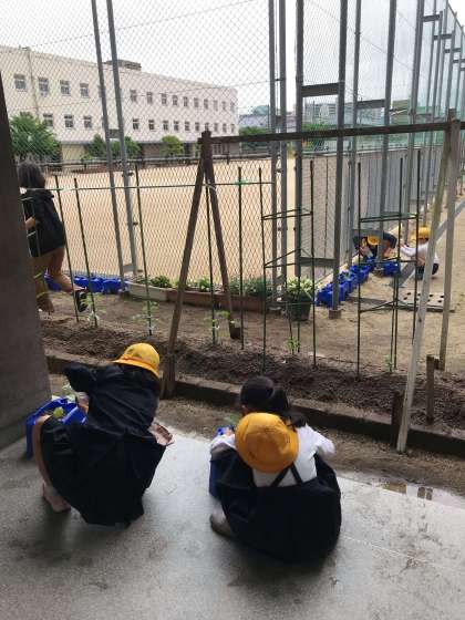 生活科の学習で苗を植えました。頑張って、毎日の世話が始まります。成長するのが、楽しみです。ナス、ミニトマト、オクラ、ピーマンの何を植えたのかな?