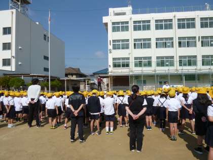 天気のよい月曜の朝です。校長先生から、本格的な夏になる前でも熱中症の可能性があります。帽子をかぶる、こまめに水分をとるなどして、体調管理に気をつけましょう。というお話がありました。