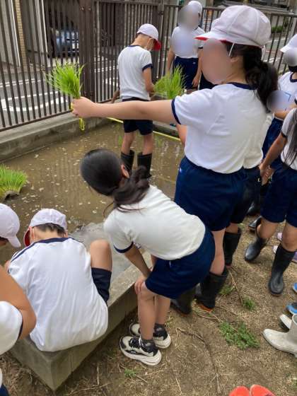 田植えをしました。水を張っておいた田んぼに一人ひとりが少しずつ稲を植えていきました。水や土が気持ちよさそうでした。大きく育って収穫できるのが楽しみです。