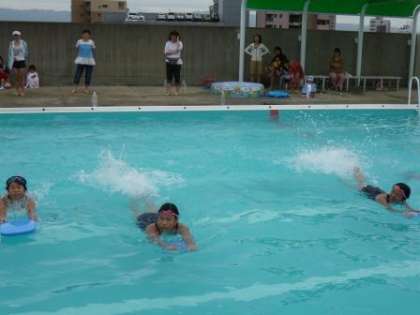 例年は7月に行われる親子プールでしたが、諸般の関係で今年度は9月に行われました。あいにくの天候で8日(日)は中止になってしまいましたが、子供たちの歓声の中、ゲームや競争などが行われました。参加児童にはおやつのおみやげもありました。