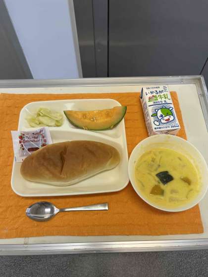 今日の給食には、夏野菜のかぼちゃデザートは、クインシーメロンが出ました