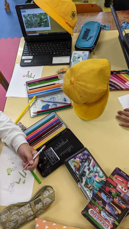野菜の収穫をしました。今日はピーマン、ナスが採れました。低学年の人から順番にもらいました。タブレットで野菜の写真をとり、それを見ながら絵を描きました。