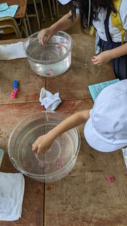 「コインおとし」よーくねらって、水槽の中におはじきを落とします。何点取れるかな?!