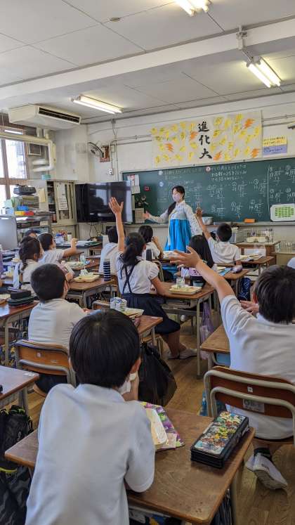 毎週金曜日はハヌルの会があります。ハヌルの会が始まるよりも早い時間にソンセンニムは学校に来てくださり、給食の時間にクラスに入り、クラスのみんなといろいろな話をします。ハヌルの会に入っている子もそうでない子も一緒に話ができる日です。今日はソンセンニムへの質問タイムでした。初めて聞く話にびっくりしたり、頷いたりして楽しく過ごしました。