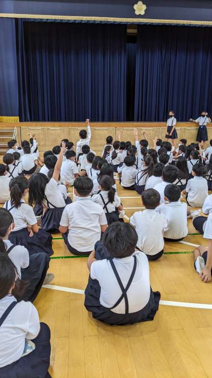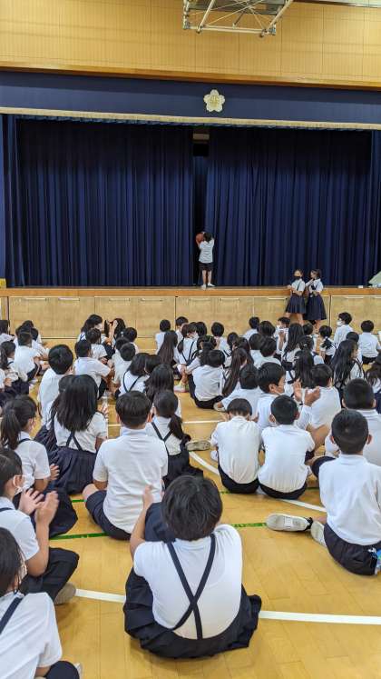 2年生4年生のペア集会でした。その名も「瞬間移動ゲーム」!カーテンの間を何が移動するか当てます。よく見てー、あっという間でした!わかったかな?!楽しそうに答えていました。