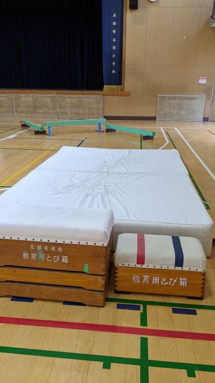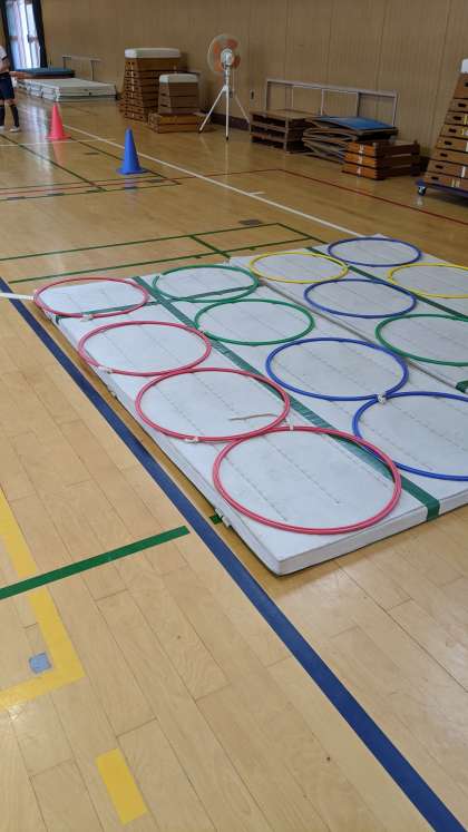 今日は体育館でサーキット運動をしました。マットの上にフラフープ、平均台や、跳び箱、ボールを足に挟んでぴょんぴょん跳びなどいろいろな体の動きをするように場が作られています。玉入れやビニール袋で作ったボールもありました。とても楽しく運動できました。