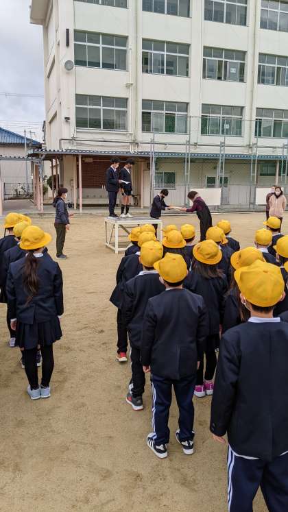 児童朝会で給食委員の児童から調理員さんに渡しました。