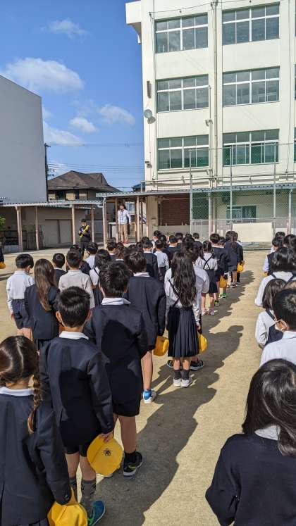 夜中の雨もあがって、運動場に出ることができました。1年生も交えての今年度最初の児童朝会です。校長先生から、4月の新しいスタートで緊張したり、疲れたりしているかもしれないので、夜はゆっくり休んでまた頑張る力をためましょう。5,6年生は今週、全国と大阪のテストが行われます。自分の力を出し切ってください、というお話がありました。今週も元気に過ごしましょう。