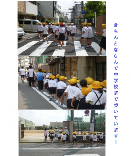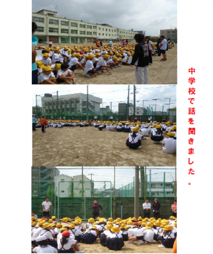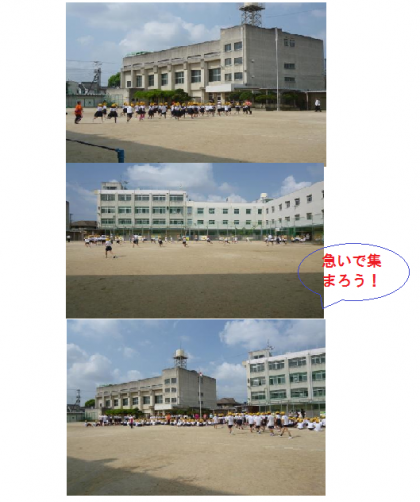 2時間目に、家庭科室が火事になったという想定で、避難訓練が行われました。運動場に集まってから、2次避難の場所の巽中学校まで歩いて移動しました。巽中学校に集まってから、今日の避難の様子について校長先生からお話がありました。集まる時間が早く、上手に避難できたと褒めていただきました。また、巽中学校の校長先生からも、褒めていただきました。