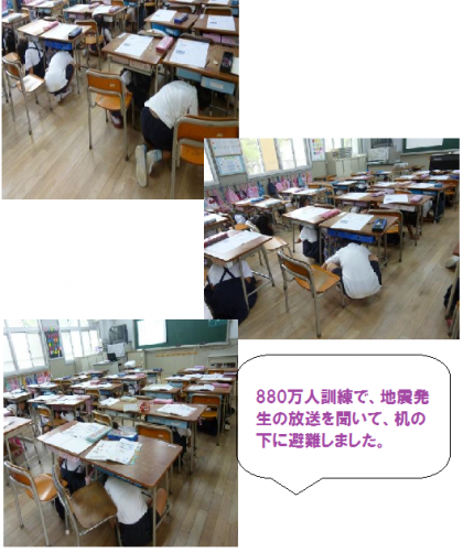 11時からの大阪880万人訓練の放送の後、教室の机の下に避難する訓練をしました。