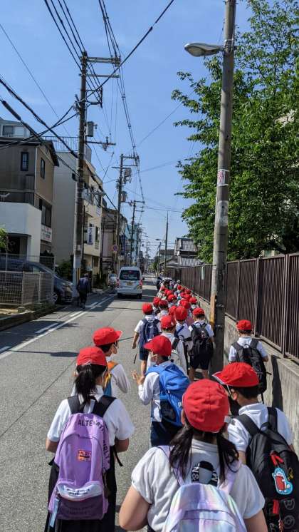 2年生が遠足に出発しました。とてもいい天気です。