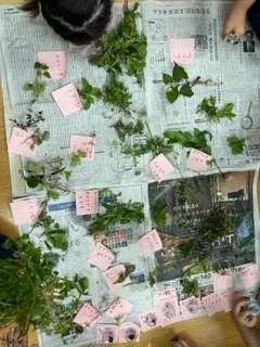 講師の方が見つけてくれた校舎内の植物を、種類ごとに分けて調べていきました。