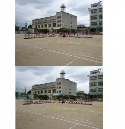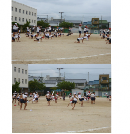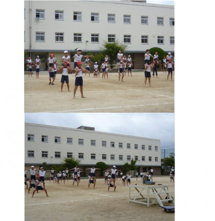初めて運動場で練習をしました。リズムのある音楽に合わせて一人技、二人技を成功させました。その後、4つのグループに分かれて、静かな音楽に合わせて動きました。