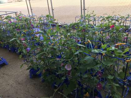 昨日の雨と今日の陽ざしのおかげか、あさがおの花が咲き誇っています。
