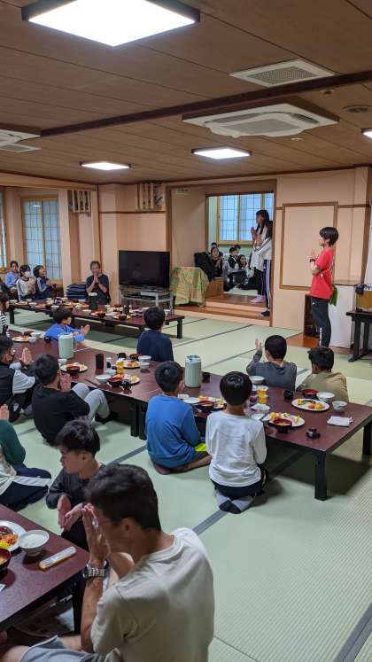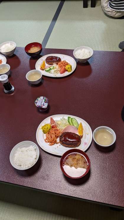 待ちに待った夕食タイムです。ハンバーグ定食です。ハンバーグはもちろん、豚汁もとてもおいしかったです。