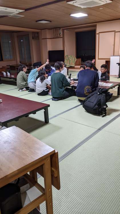 今日一日の反省をして、明日の連絡を班の人に伝えます。林間初日、みんなよく頑張りました。明日もしっかり活動できるよう、今日は早めに休みましょう。今日の更新はここまでです。おやすみなさい。