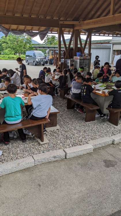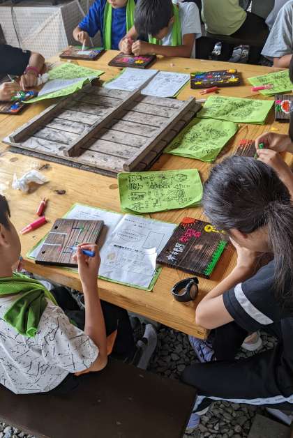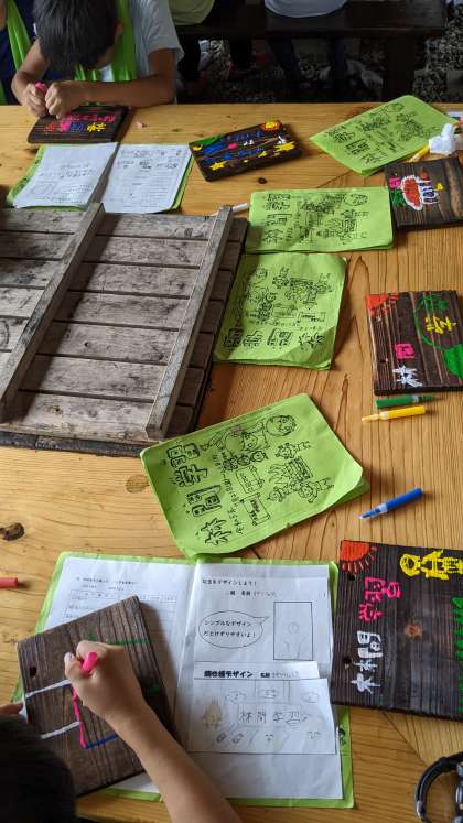 飯盒炊さんのあとは焼き板です。昨日、磨いた板にペイントします。下絵は学校で描いて来たので、それを見ながら進めます。林間の思い出になる言葉や絵を描いてこの林間の記念にします。