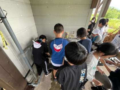 班で協力して鍋の炭がなくなるまで洗っています。がんばれ!