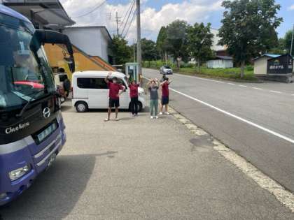 この後は、道の駅まほろば→SA赤松を経由して学校へ向かいます。到着予定時間は17時ごろを予定しております。お迎えのご都合ある保護者の方がいらっしゃいましたら、ホームページをご参考ください。よろしくお願い致します。