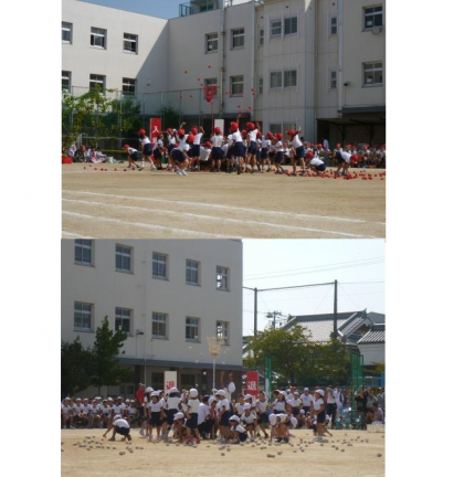 1年生の、玉入れ、団体演技、かけっこの様子です。