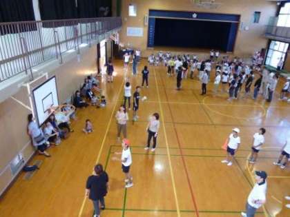 最後は、フリースローリレーです。親子でパスしながら、ゴールの下まで行き、親も子もシュートが決まるまで帰れません。帰りは親子の背中でボールをはさんで帰ります。意外と入らないシュートにやきもきするのもコミュニケーションの一つになりました。