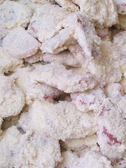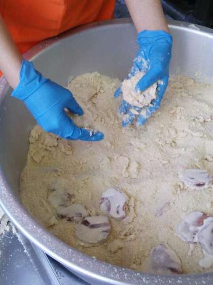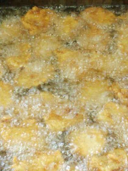 今日は、みそカツです。1つ1つパン粉をつけて揚げていきます。