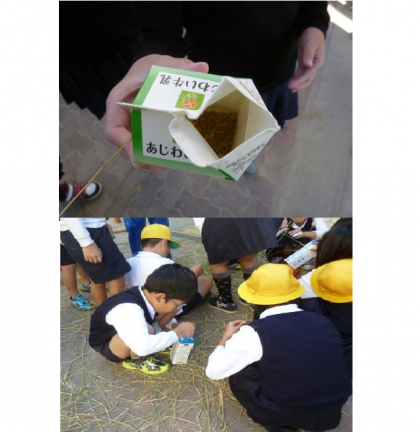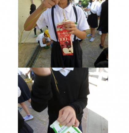 今日は先日稲刈りをしたお米の脱穀をしました。牛乳パックの中に稲を入れてふたをします。そして、茎を引っ張ると稲が下に落ちます。簡単にできるので、楽しんで活動していました。