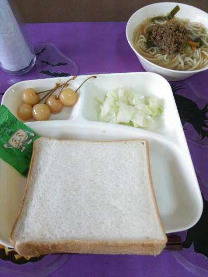今日の食パンにはマーガリンがつきました。さくらんぼは1人5個です。